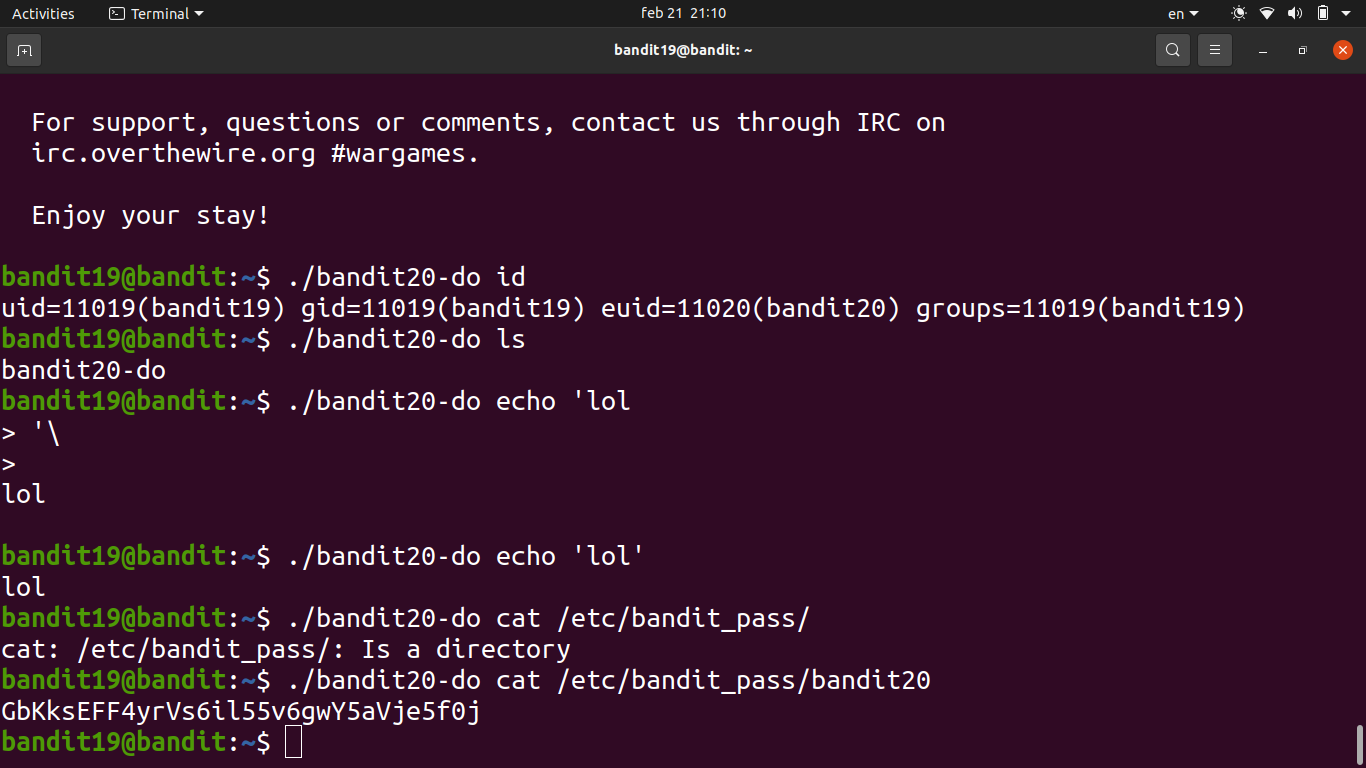./bandit20-do cat /etc/bandit_pass/bandit20lets us read the password file that would normally be off-limits.- The binary basically gives us a one-shot privilege escalation — we can only run commands as bandit20 through it, not get a full shell.