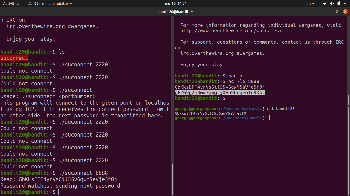 suconnectin the home directory. It connects to a port on localhost, reads one line of input, and if it matches the current level’s password it returns the next one. -
