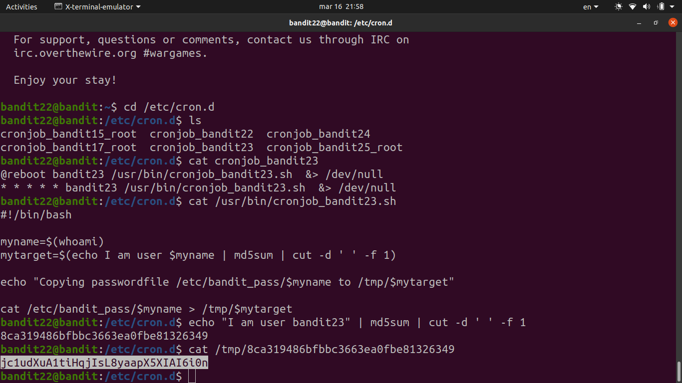 md5sumof the string"I am user bandit23"and writes the bandit23 password to/tmp/<that_hash>. - We can reproduce the same hash ourselves: