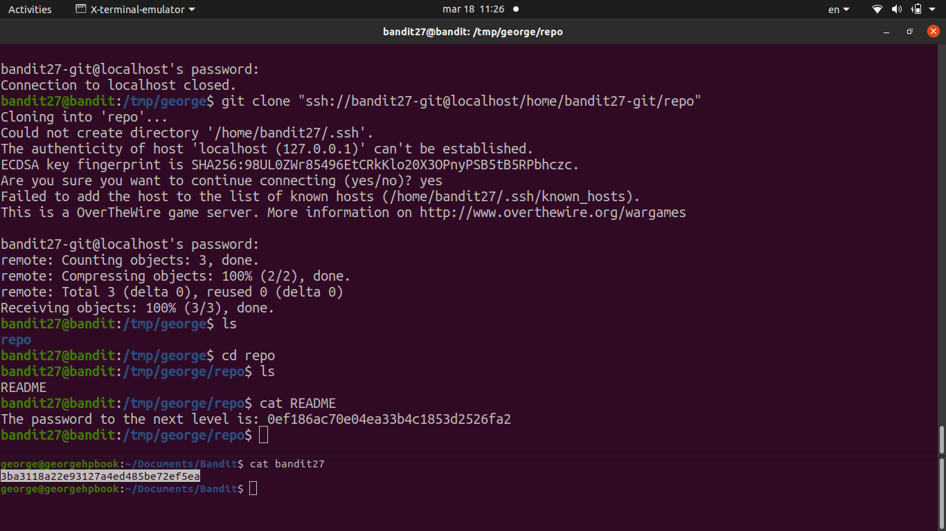 git clone ssh://bandit27-git@localhost:2220/home/bandit27-git/repo /tmp/repo27clones the repo into a temp directory (we can’t write to the home directory).- Once cloned, the password is just sitting in a