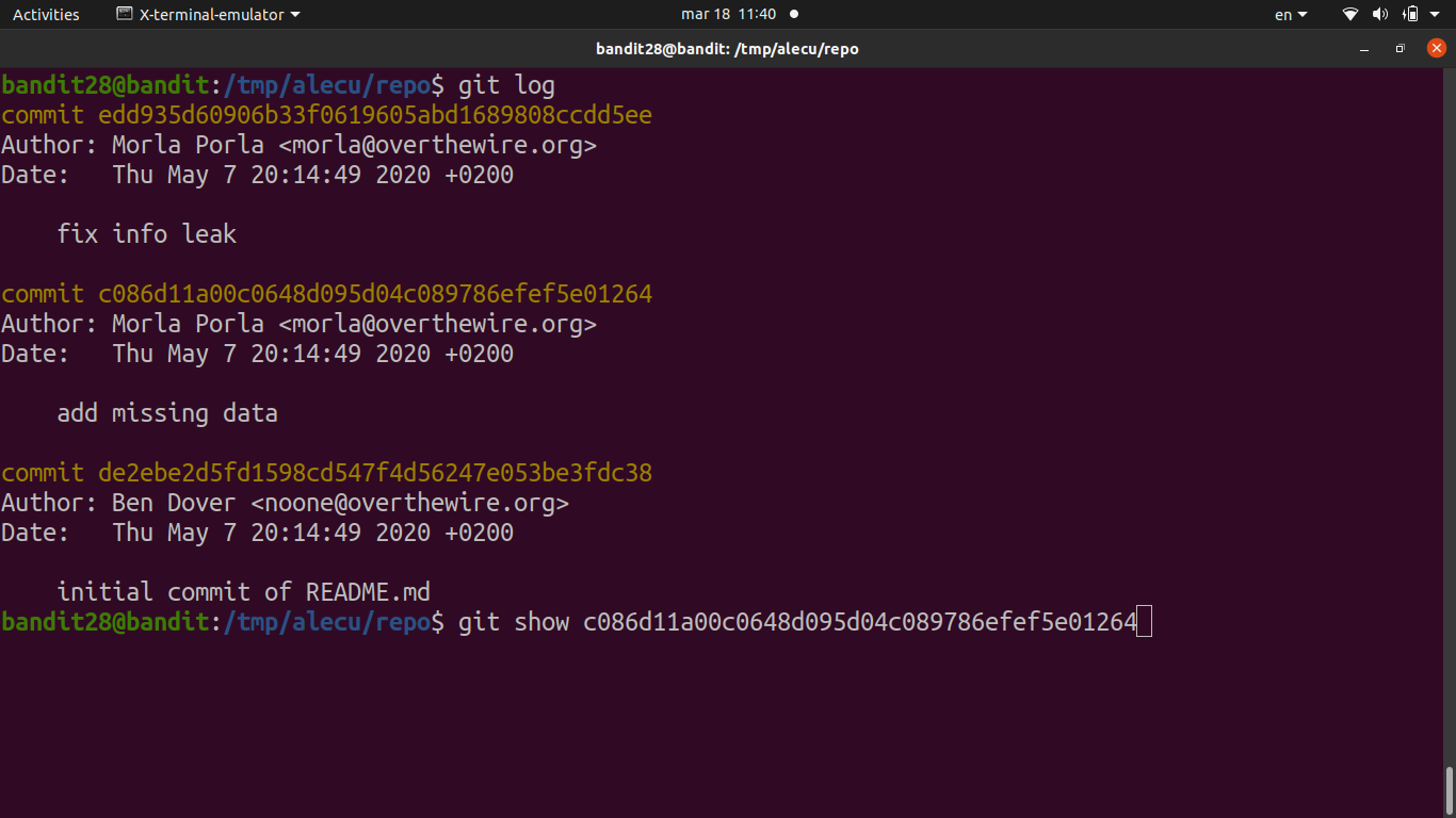 git logshows the commit history andgit show <hash>lets us inspect any individual commit.- Found a commit with the message “fix info leak”