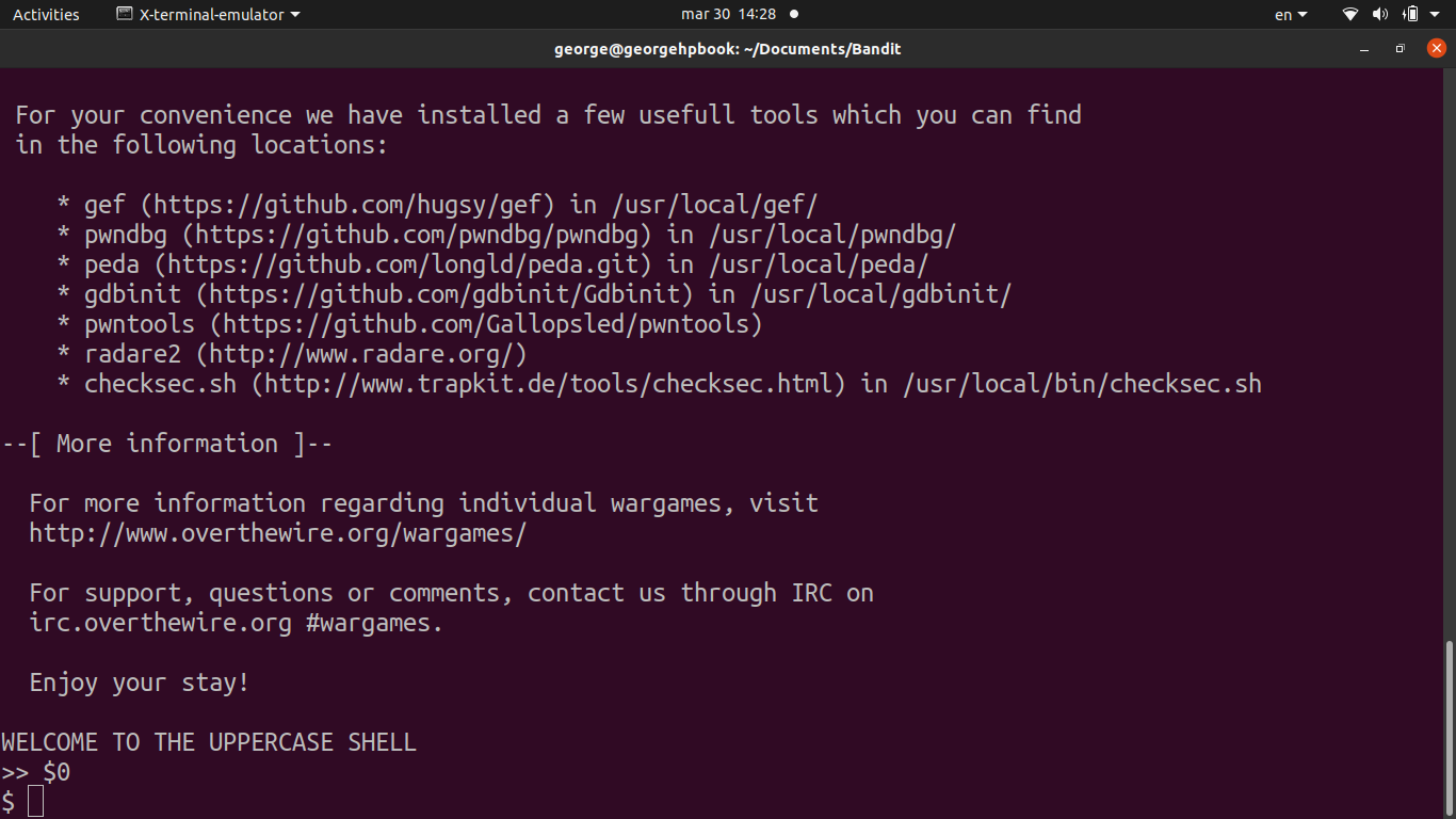 - After logging in, you’re dropped into what the prompt calls the “UPPERCASE SHELL”, which converts everything you type to uppercase before executing it.