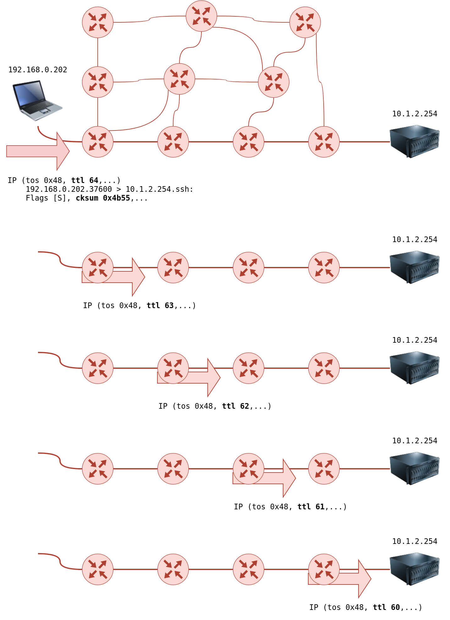 - Initially, it leaves the system with a TTL value of 64; it reaches the target system with a TTL value of 60 after passing through 4 routers.