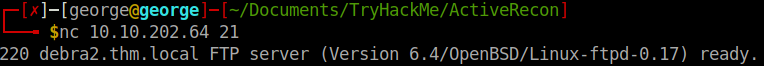 - Start the VM and open the AttackBox. Once the AttackBox loads, use Netcat to connect to the VM port 21. What is the version of the running server?