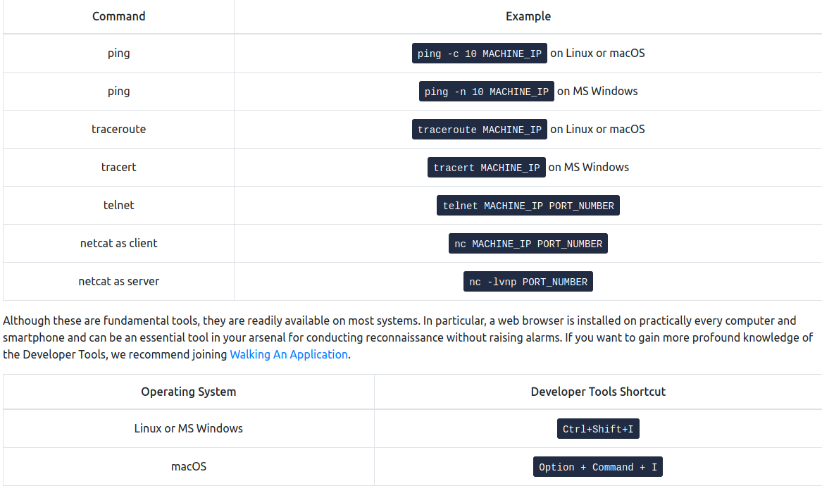 You can use traceroute to map the path to the target, ping to check if the target system responds to ICMP Echo, and telnet to check which ports are open and reachable by attempting to connect to them.