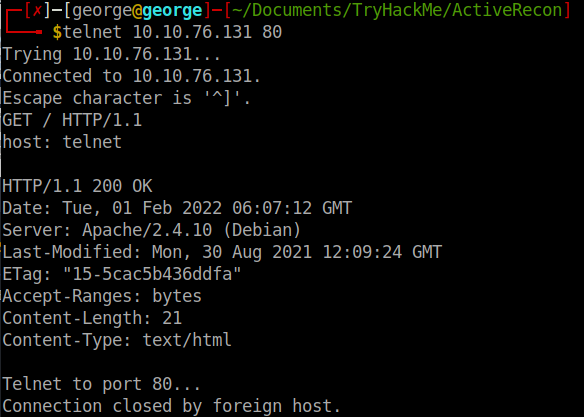 - Start the attached VM from Task 3 if it is not already started. On the AttackBox, open the terminal and use the telnet client to connect to the VM on port 80. What is the name of the running server?