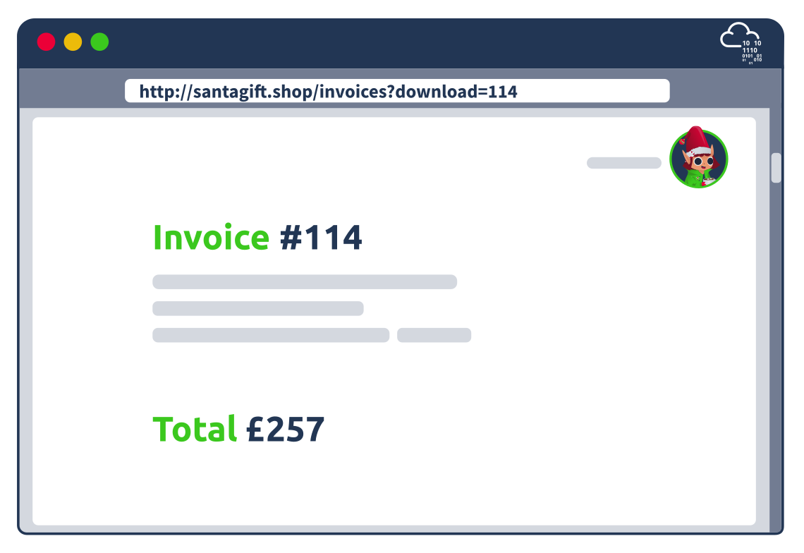 http://santagift.shop/invoices?download=115. - To test for vulnerabilities, one would replace
