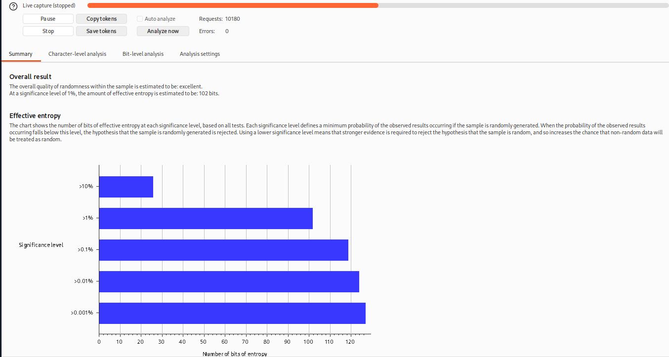 Overall result: This gives a broad assessment of the security of the token generation mechanism. In this case, the level of entropy indicates that the tokens are likely securely generated.