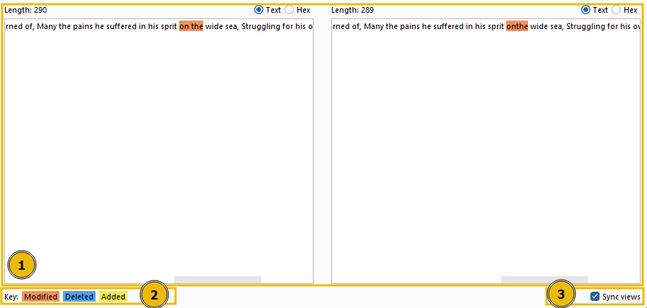 - The compared data occupies most of the window; it can be viewed in either text or hex format. The initial format depends on whether we chose to compare by words or bytes in the previous window, but this can be overridden by using the buttons above the comparison boxes.