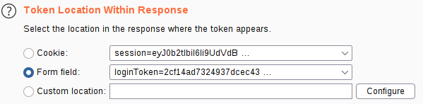 In the “Token Location Within Response” section, we can select between Cookie, Form field, and Custom location. Since we’re testing the loginToken in this case, select the “Form field” radio button and choose the loginToken from the dropdown menu: