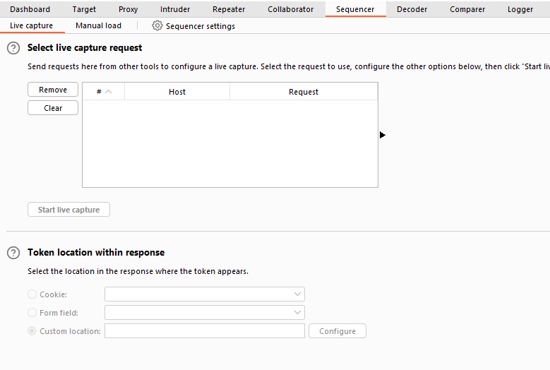 Live Capture: This is the more common method and is the default sub-tab for Sequencer. Live capture lets us pass a request that will generate a token to Sequencer for analysis. For instance, we might want to pass a POST request to a login endpoint to Sequencer, knowing that the server will respond with a cookie. With the request passed in, we can instruct Sequencer to start a live capture. It will then automatically make the same request thousands of times, storing the generated token samples for analysis. After collecting enough samples, we stop the Sequencer and allow it to analyze the captured tokens.