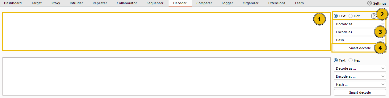 - This box serves as the workspace for entering or pasting data that requires encoding or decoding. Consistent with other modules of Burp, data can be moved to this area from different parts of the framework via the Send to Decoder option upon right-clicking.