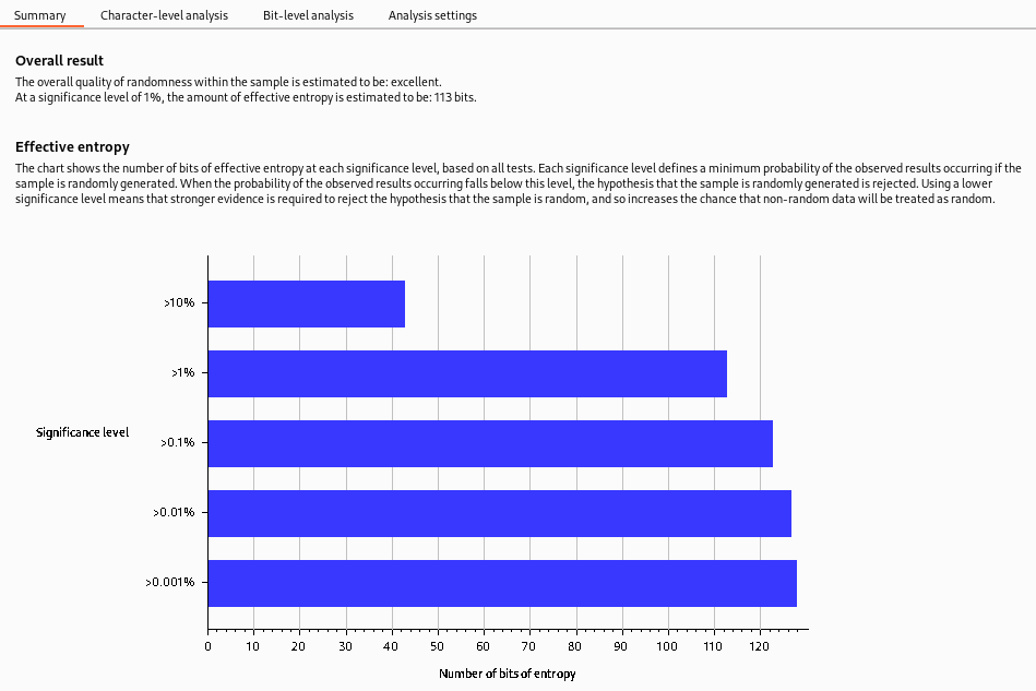While the entropy report can provide a strong indicator of the security of the token generation mechanism, there needs to be more definitive proof. Other factors could also impact the security of the tokens, and the nature of probability and statistics means there’s always a degree of uncertainty. That said, an effective entropy of 117 bits with a significance level of 1% suggests a robustly secure token generation process.