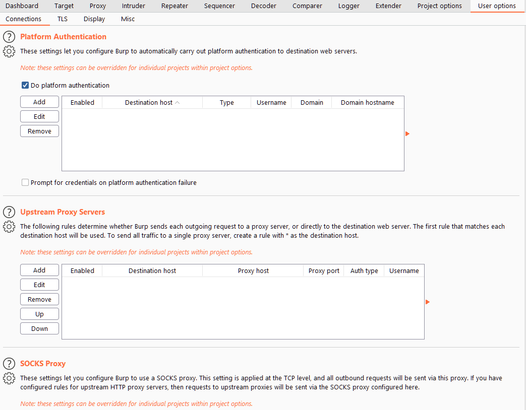 - The options in the Connections sub-tab allow us to control how Burp makes connections to targets.