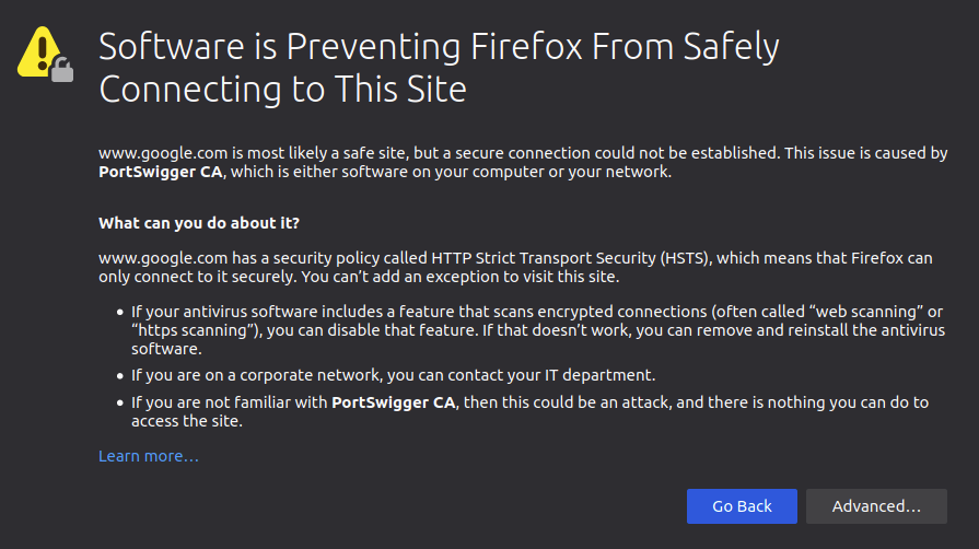We need to get Firefox to trust connections secured by Portswigger certs, so we will manually add the CA certificate to our list of trusted certificate authorities.