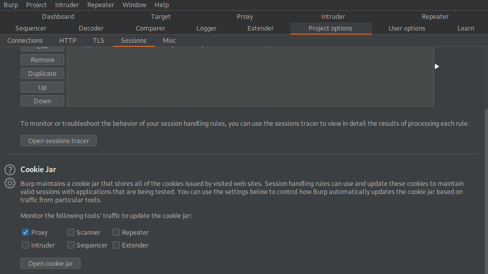 In which Project options sub-tab can you find reference to a “Cookie jar”?