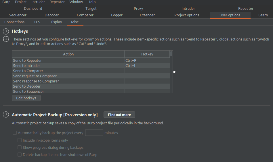 - The Misc sub-tab contains a wide variety of settings, including the keybinding table (HotKeys), which allowing us to view and alter the keyboard shortcuts used by Burp Suite. Familiarising yourself with these settings would be advisable, as using the keybinds can speed up your workflow massively.