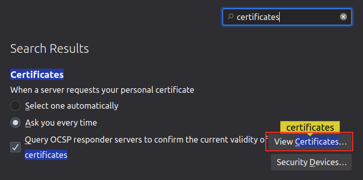 - Search the page for “certificates” and we find the option to “View Certificates”: