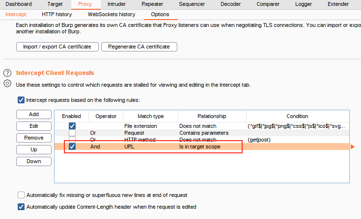 - With this option selected, the proxy will completely ignore anything that isn’t in the scope, vastly cleaning up the traffic coming through Burp.