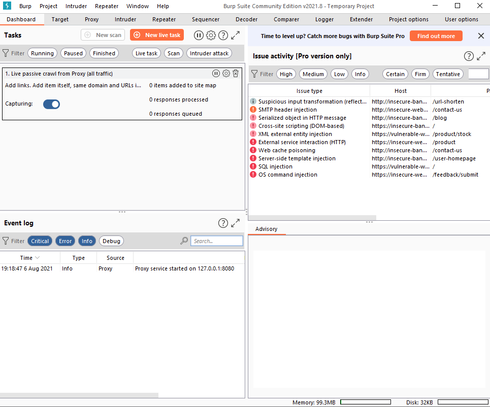 The Issue Activity section is exclusive to Burp Pro. It won’t give us anything using Burp Community, but in Burp Professional it would list all of the vulnerabilities found by the automated scanner. These would be ranked by severity and filterable by how sure Burp is that the component is vulnerable.