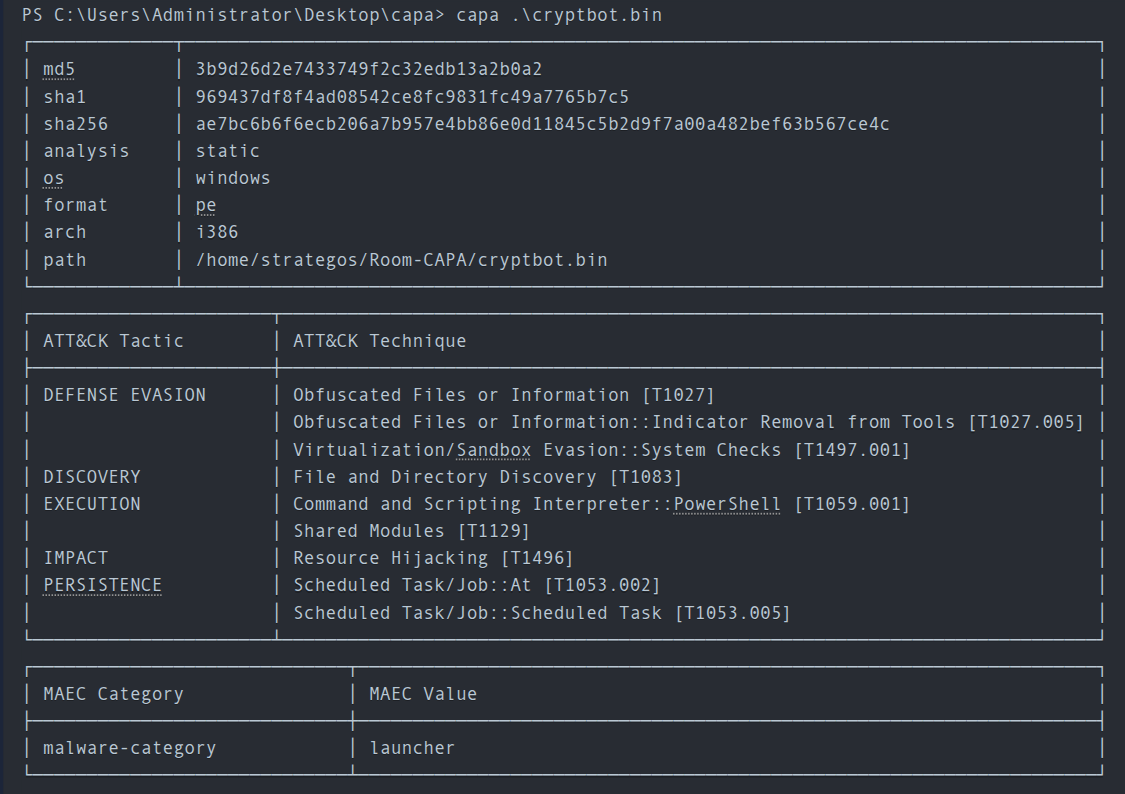 In CAPA’s final output, they referenced the MITRE Framework. This helps analysts or defenders map the file’s behaviour to the adversary’s playbook, which can help narrow down the scope of the investigation during an incident