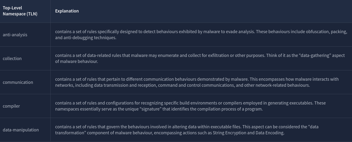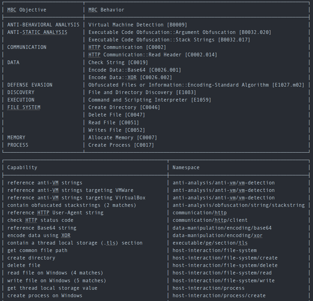 CAPA (Common Analysis Platform for Artifacts) is a tool developed by the FireEye Mandiant team. It is designed to identify the capabilities present in executable files like Portable Executables (PE), ELF binaries, .NET modules, shellcode, and even sandbox reports. It does so by analyzing the file and applying a set of rules that describe common behaviours, allowing it to determine what the program is capable of doing, such as network communication, file manipulation, process injection, and many more.