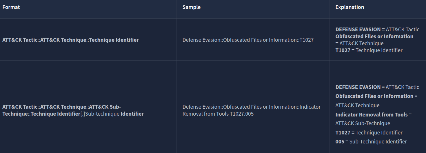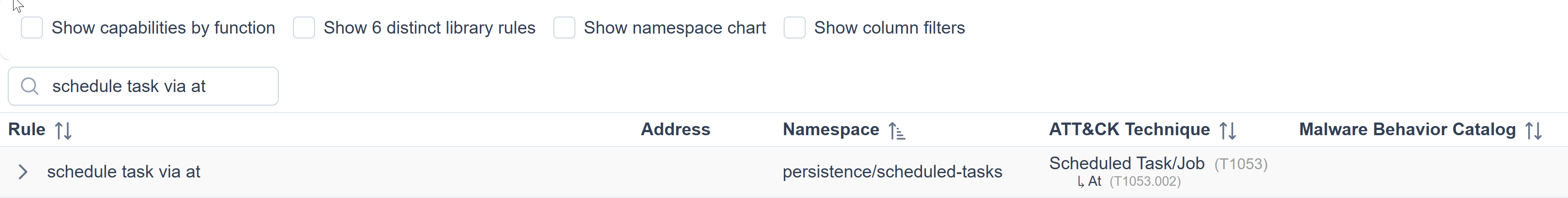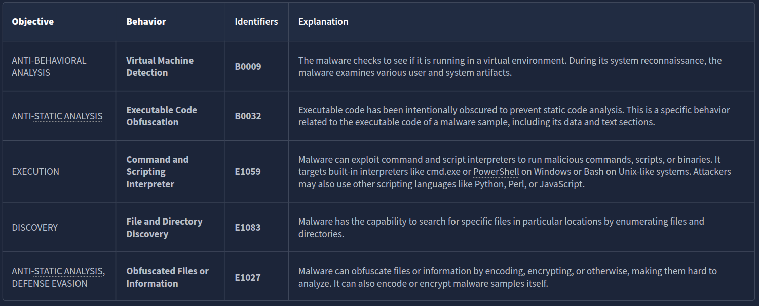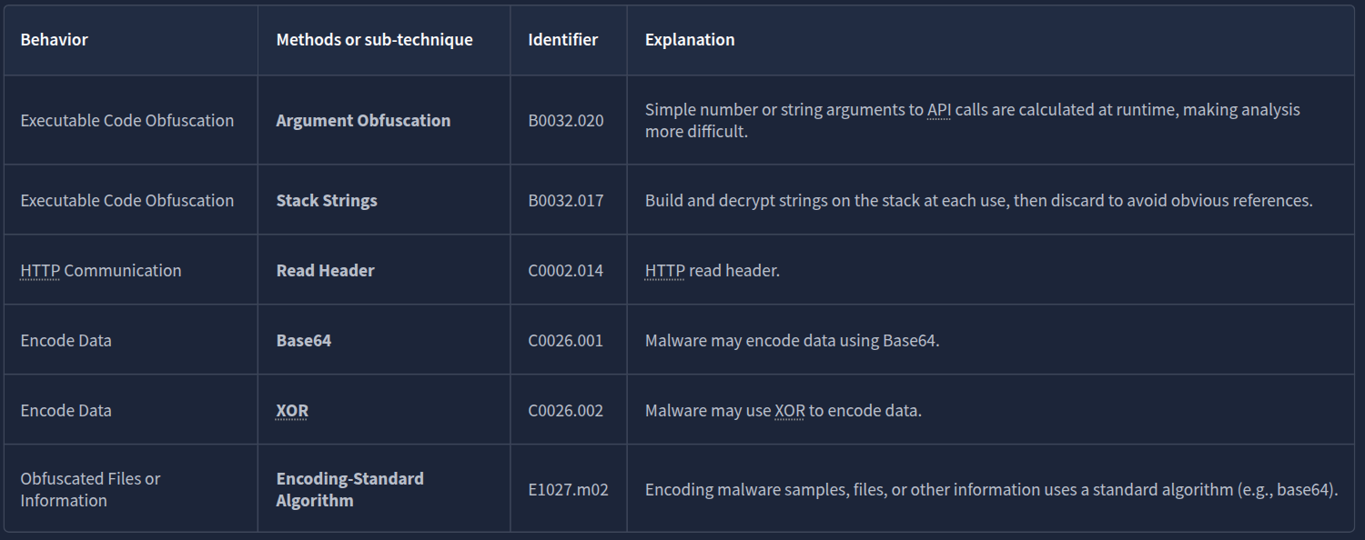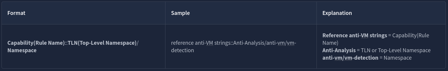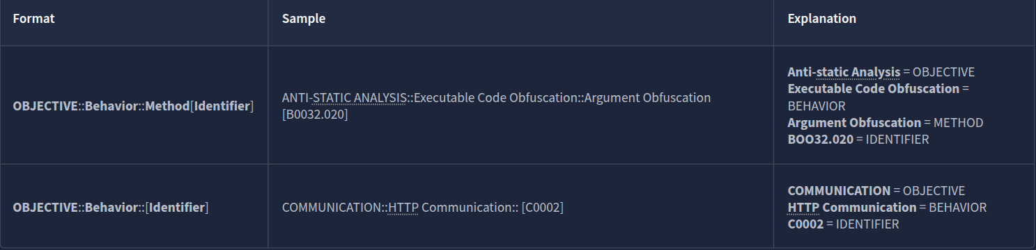 CAPA uses this format for the output. Note that some results may or may not contain the Technique and Sub-technique Identifier.
