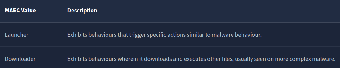 Additionally, when CAPA tags a file with a “Downloader” MAEC value, it indicates that the file demonstrates behaviour similar but not limited to: