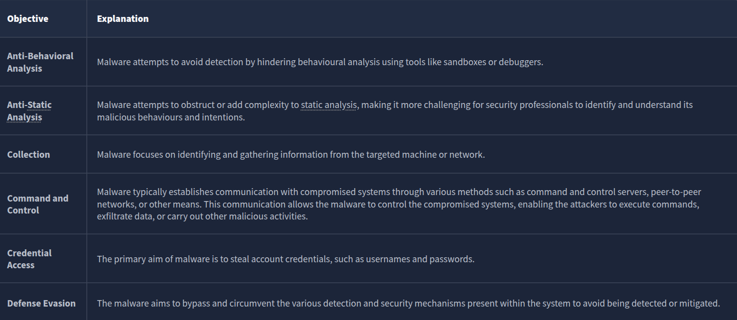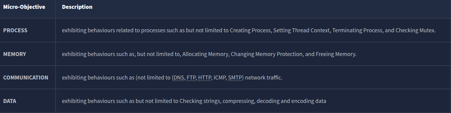 Q: What serves as a catalogue of malware objectives and behaviours?