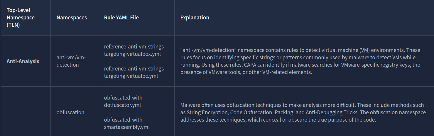 Each namespace has a collection of rules inside them that are also grouped together. For anti-vm/vm-detection, we have rules, and it’s config file, such as: