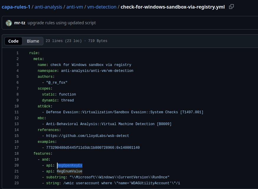 We know that the capability was to reference anti-VM strings targeting VMWare, and the corresponding rule config file or yaml file is anti-VM-Strings-targeting-VMWare.yml. Notice the box from the image.