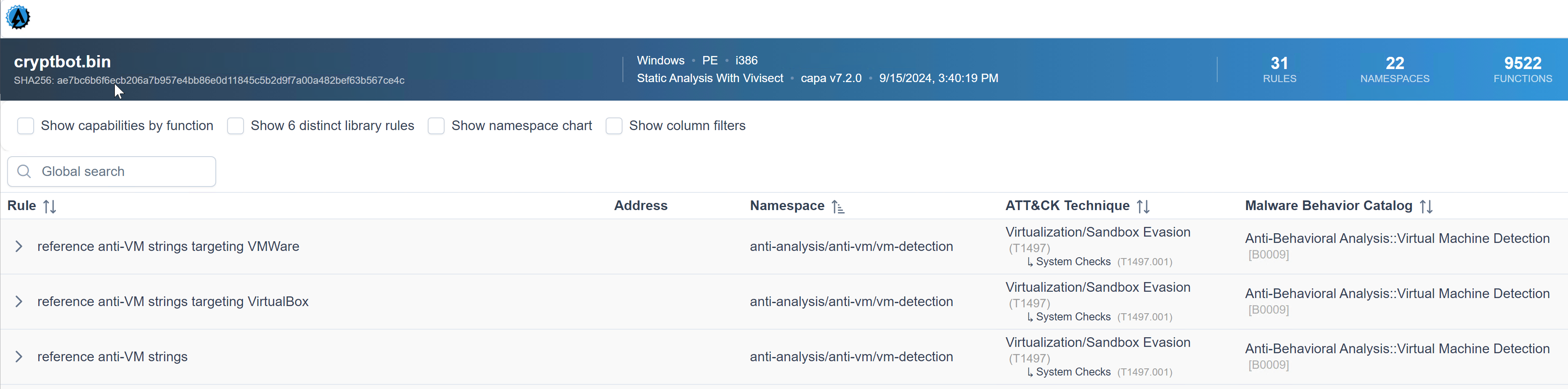 o analyze this result with ease, we need to do two things. First, we will use the parameter -j and -vv, and direct the result to a .json file. The command would be capa.bin -j -vv .\cryptbot.bin > cryptbot_vv.json