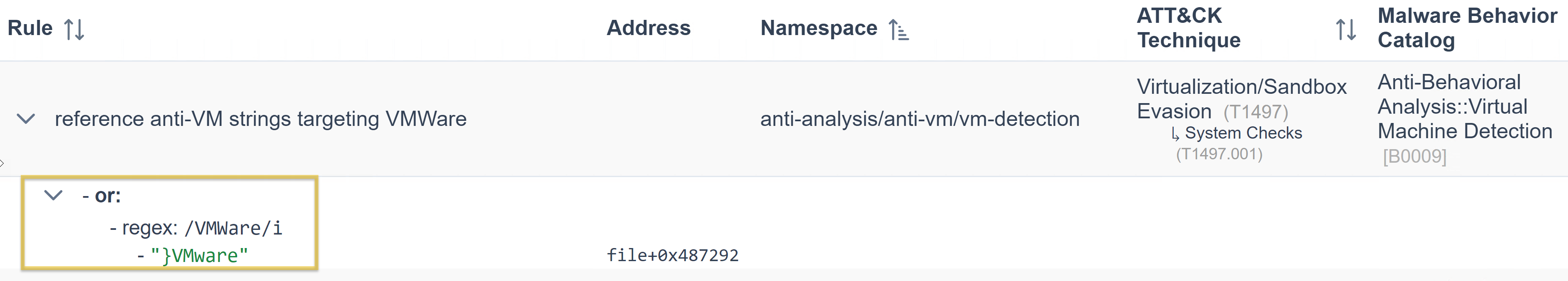 Did you see it? That’s right! Under the features, the “string: /VMWare/i” is being referenced by CAPA Web Explorer. Simply, CAPA is saying that under this namespace, we could identify strings with a value of VMWare by using the conditions within the rule and with regex.