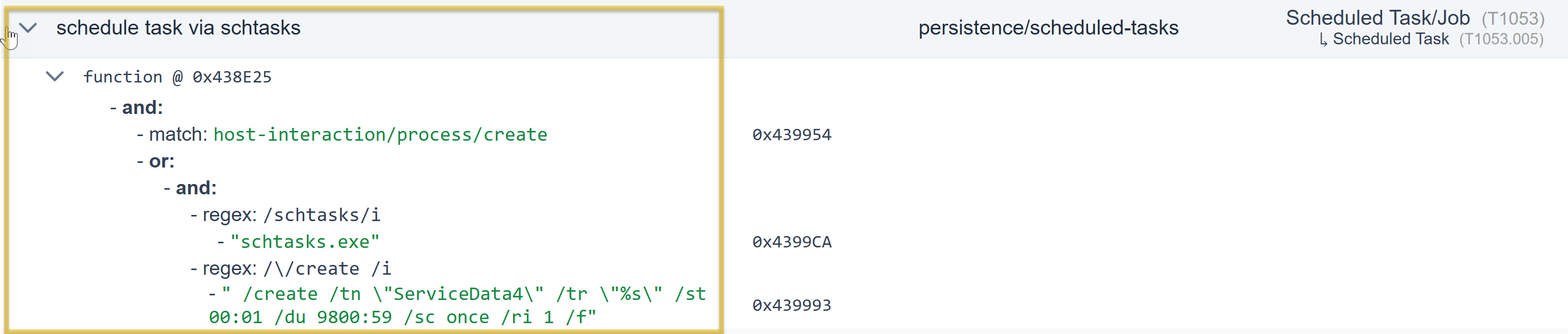 Let’s have another sample. We know that the capability was to reference the scheduled task via schtasks, and the corresponding rule was to schedule the task via schtasks.yml. Notice the box from the image.