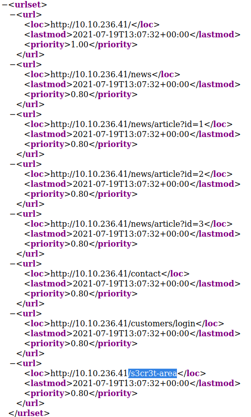 - What is the path of the secret area that can be found in the sitemap.xml file?