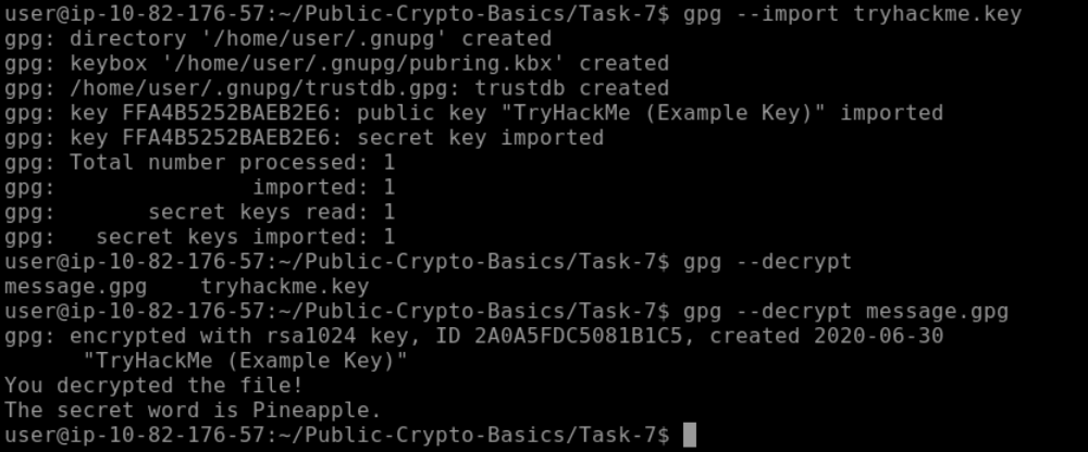 Q: Use GPG to decrypt the message in ~/Public-Crypto-Basics/Task-7. What secret word does the message hold?