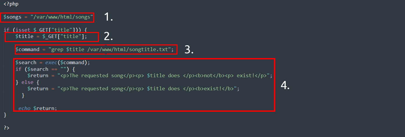 In this code snippet, the application takes data that a user enters in an input field named $title to search a directory for a song title. Let’s break this down into a few simple steps.