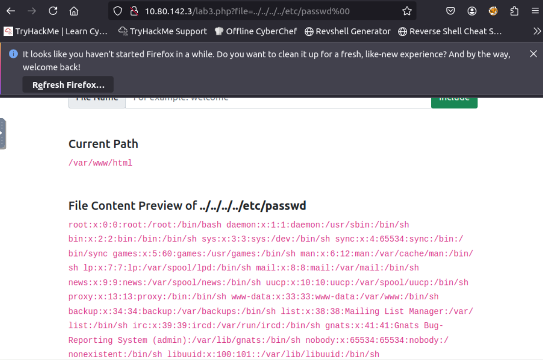Warning: include(languages/etc/passwd): failed to open stream: No such file or directory in /var/www/html/THM-5/index.php on line 15