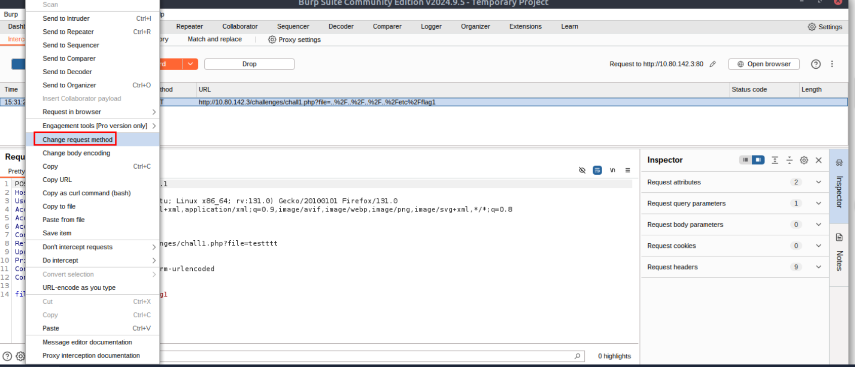 Add the input ../../../../etc/flag1 to the website and then intercept the request with Burp. Right click on the request and choose Change Request Method for Burp to change the GET into a POST request.