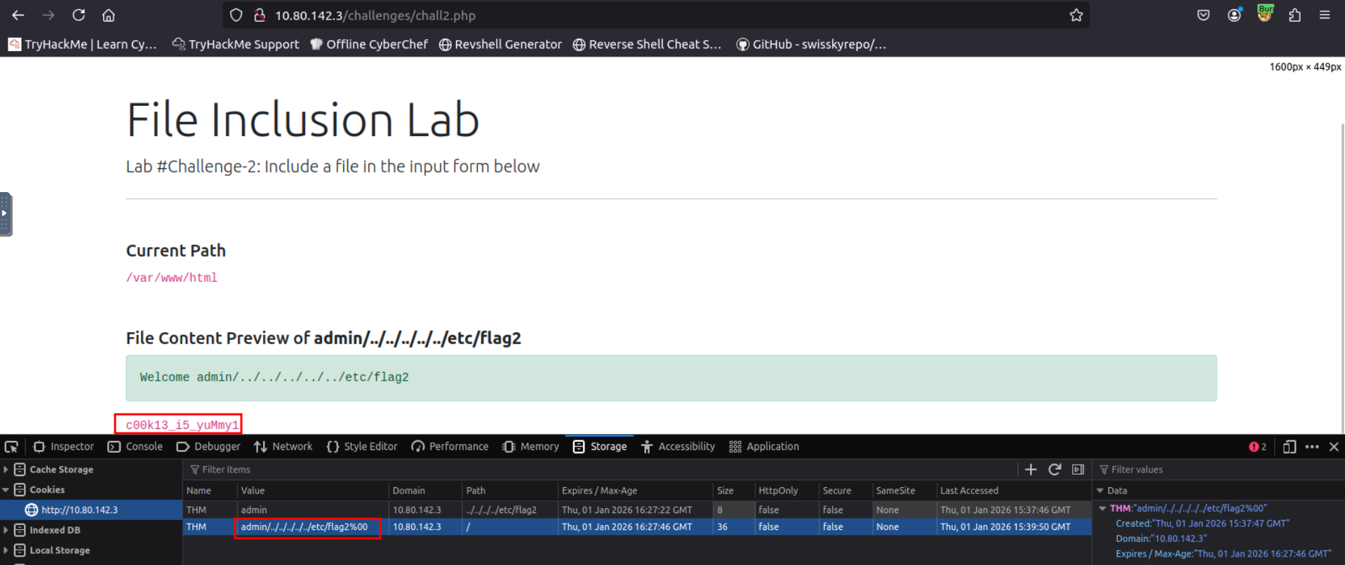 The cookie includes an LFI vulnerability, so in order to output the flag, one needs to modify the value accordingly (make sure to add the null byte at the end as well to get rid of the .php extension being added automatically). I got to this cookie value: admin/../../../../../etc/flag2%00