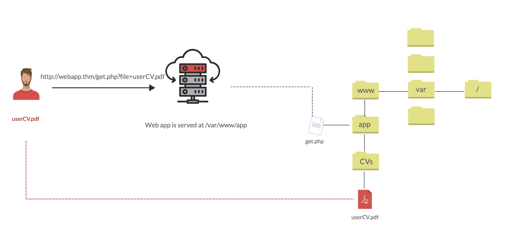 Let’s discuss a scenario where a user requests to access files from a webserver. First, the user sends an HTTP request to the webserver that includes a file to display. For example, if a user wants to access and display their CV within the web application, the request may look as follows, http://webapp.thm/get.php?file=userCV.pdf, where the file is the parameter and the userCV.pdf, is the required file to access.
