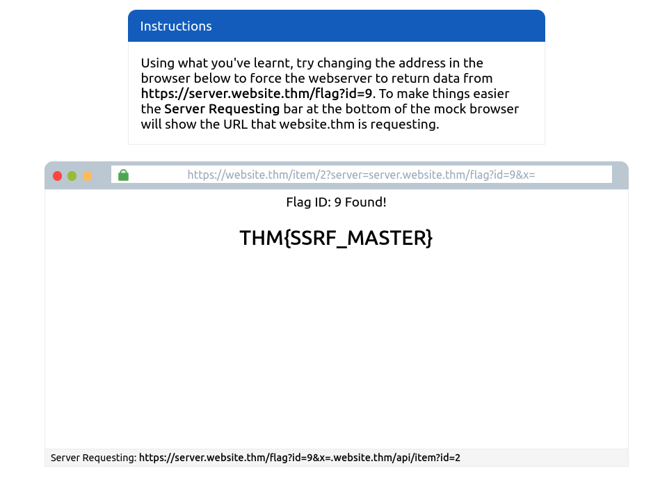 The Expected Request is what the website.thm server is expecting to receive, with the section in red being the URL that the website will fetch for the information.