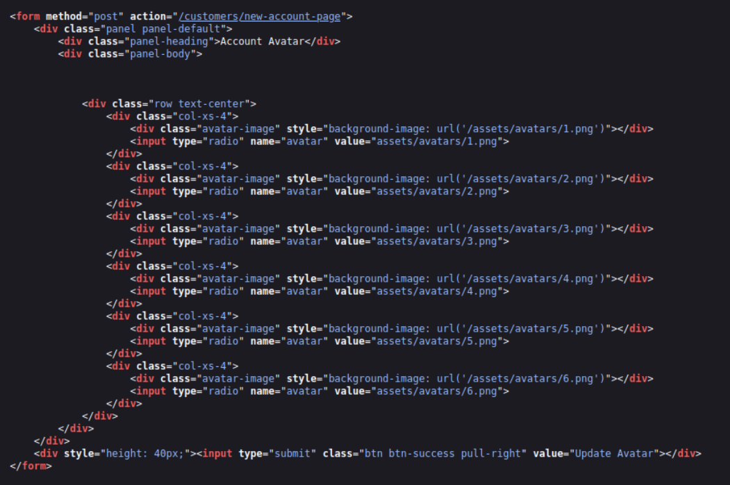 First, create a customer account and sign in. Once you’ve signed in, visit https://10-80-188-95.reverse-proxy.cell-prod-eu-west-1a.vm.tryhackme.com/customers/new-account-page to view the new avatar selection feature. By viewing the page source of the avatar form, you’ll see the avatar form field value contains the path to the image. The background-image style can confirm this in the above DIV element as per the screenshot below: