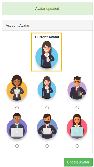 If you choose one of the avatars and then click the Update Avatar button, you’ll see the form change and, above it, display your currently selected avatar.