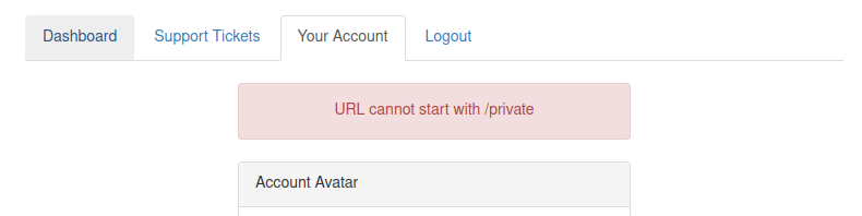 As you can see from the error message, the path cannot start with /private but don’t worry, we’ve still got a trick up our sleeve to bypass this rule. We can use a directory traversal trick to reach our desired endpoint. Try setting the avatar value to x/../private