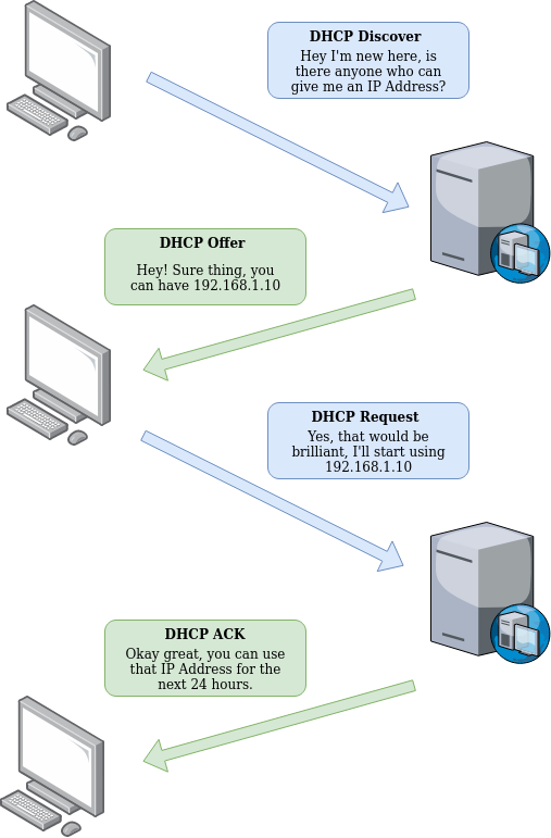 When a device has not been configured manually with an IP address, a request is made to discover a DHCP server (DHCP Discover). The DHCP sends a possible IP address the device could use (DHCP Offer). The device sends a reply confirming it wants that IP (DHCP Request) and lastly, the DHCP sends a reply acknowledging this has been completed and that the device can now use that IP address (DHCP ACK).